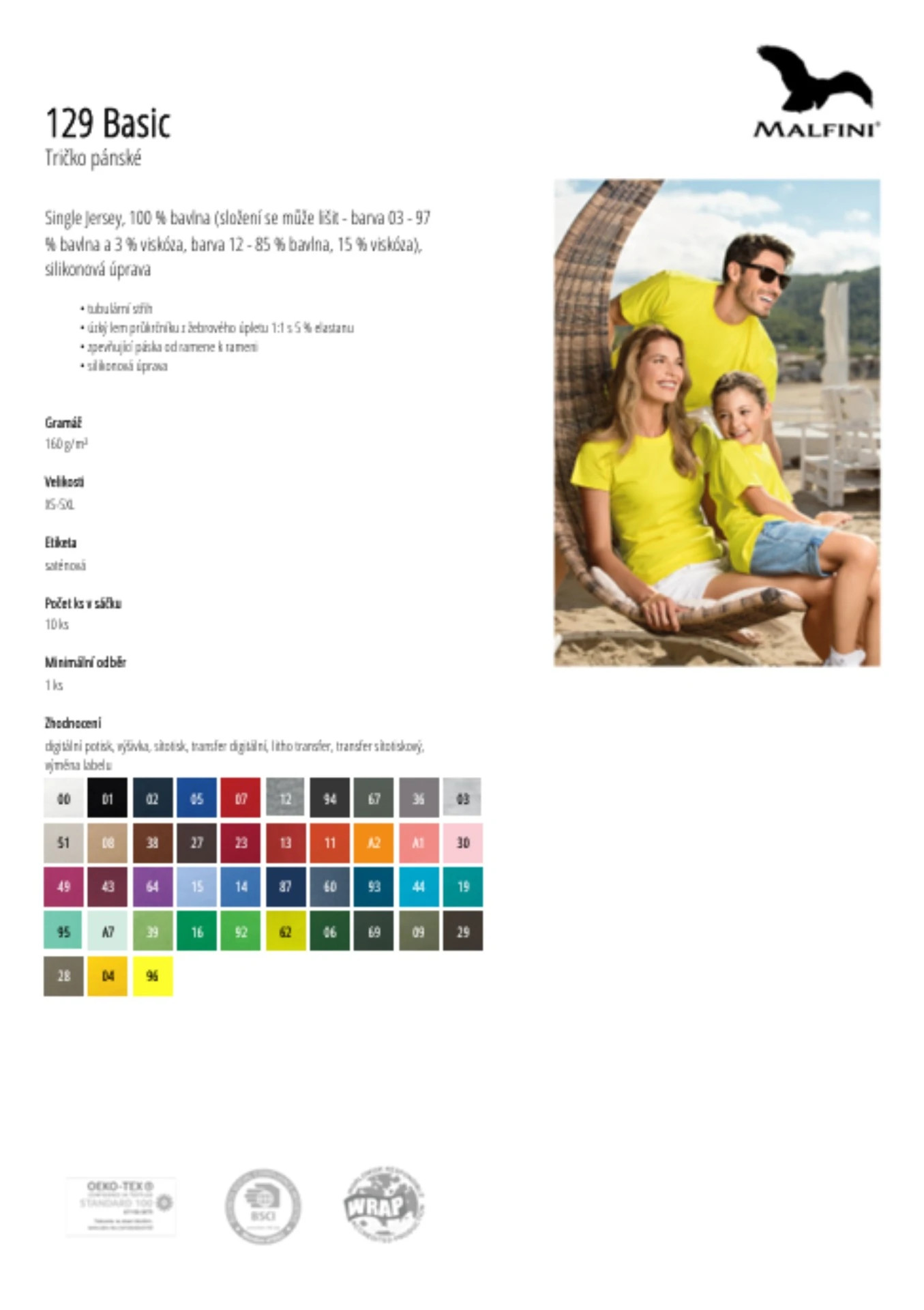 • Single Jersey, 100 % bavlna (složení se může lišit - barva 03 - 97 % bavlna a 3 % viskóza, barva 12 - 85 % bavlna, 15 % viskóza), silikonová úprava