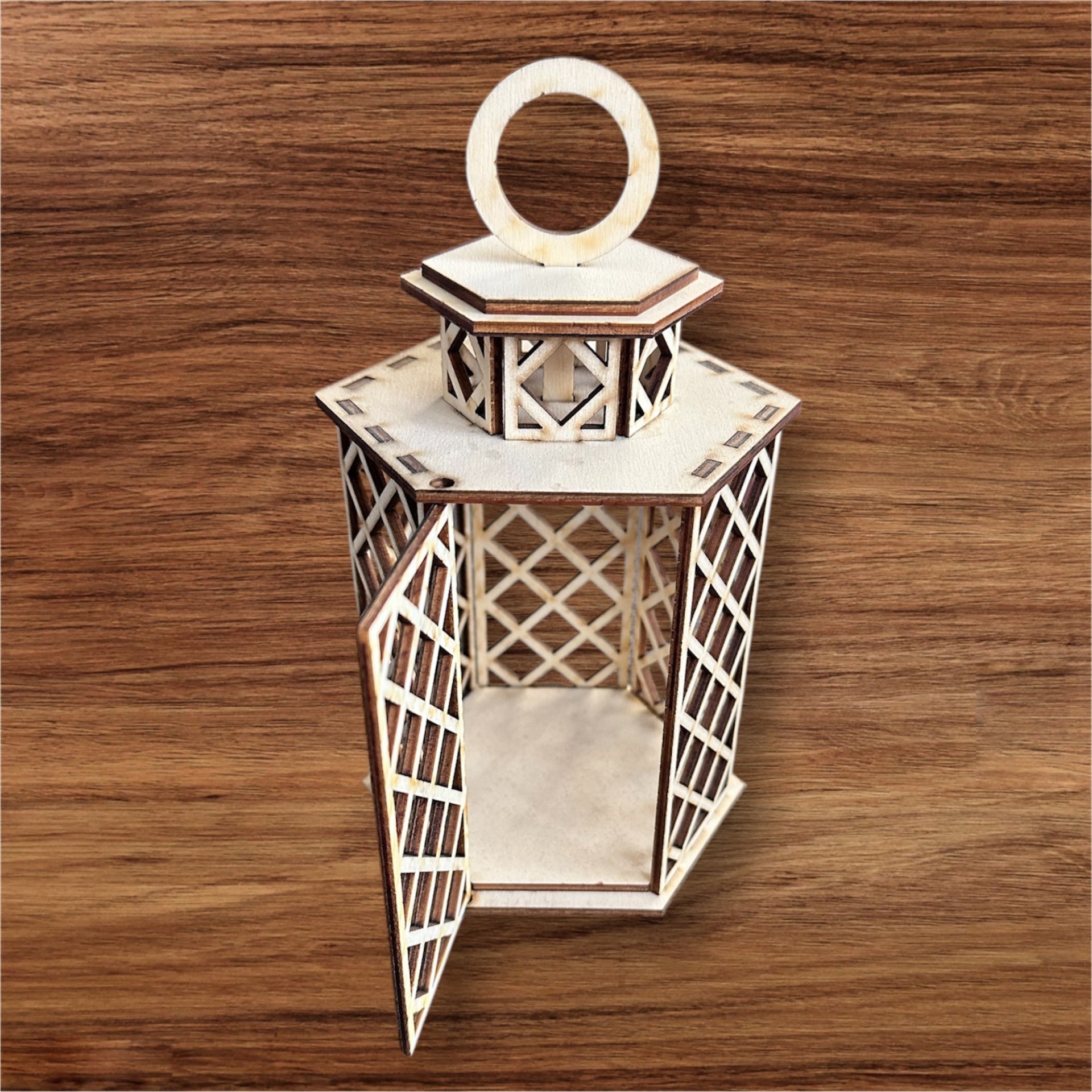 Dřevěná lucerna s otevíracími dvířky.